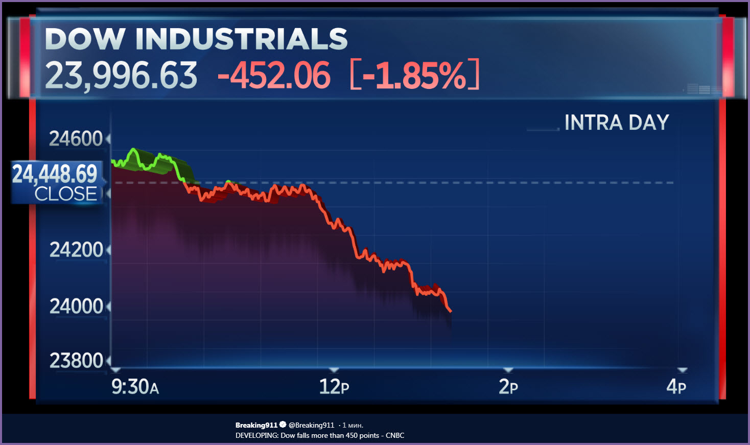 Цитата: idioten test от 24.04.2018 19:33:11Я Вам больше скажу - Доу взгрустнул еще сильнее после Вашей заметки, и сейчас плавно крадется к 2,50 % падению. (около 600 пунктов вниз единомоментно). ЧуднО, ей-богу.... Ставку чтоль еще раз решили повышать? Так рановато...Понятно, что все эти доу-шмоу уже давно только дутые нолики в компьютере, но раньше им больше доверяли люди-то.Скрытый текст