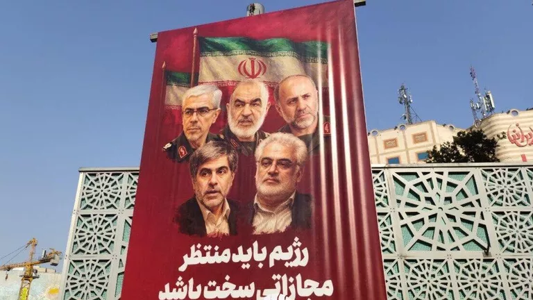Как на этих площадях, так и на улицах города вывешены плакаты с портретами погибших в ходе ударов Израиля иранских военачальников и ученых и высказыванием Верховного лидера Ирана аятоллы Али Хаменеи:
