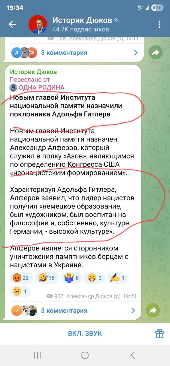 Цитата: БужанскийЯ не знаком с новым главой Института Национальной Памяти Алферовым, никогда не узнал бы, что там квакает российская помойка "одна родина", если бы это квакание не перепостил российский же пропагандист Дюков, считающийся у них практически умным.