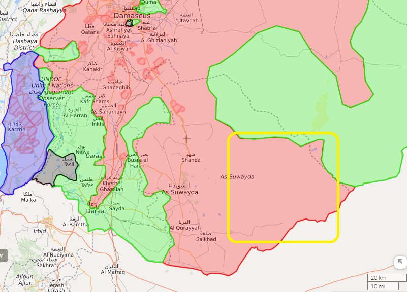 Цитата: Olegask от 10.08.2017 15:03:35Как развивается ситуация на границе с Ираком и Иорданией этим летом. САА и союзники хорошо продвинулись вокруг иракской границы, границу с Иорданией отбить сложнее из-за американского влияния там. Хотя по данным последних часов, не отраженных в карте, и там наметился значительный успех.Вот еще вариант карты Сувейды:
