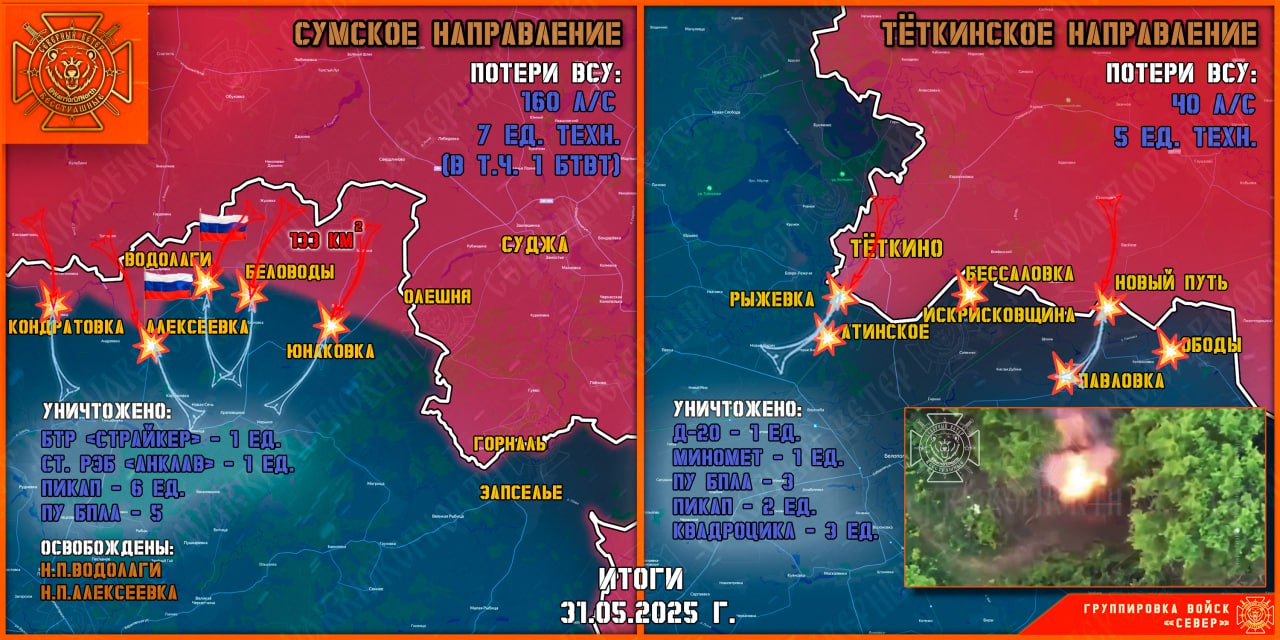 31 мая группировка войск "Север" уничтожала передовые и штурмовые подразделения противника на Тёткинском и Глушковском направлениях, продолжила создание полосы безопасности в Сумской области