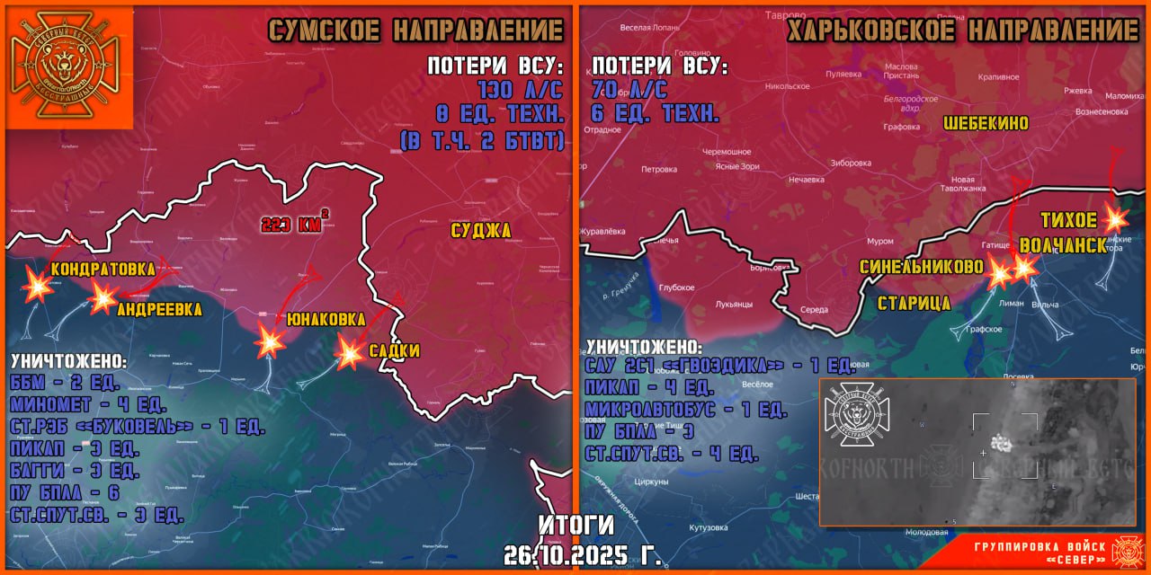 Вчера днём и ночью ВКС и ракетные войска наносили удары по целям на Донбассе, в Сумской, Харьковской, Запорожской и Херсонской областях (весь спектр средств поражения), Кривом Роге (УМПК) Сновске и Корюковке Черниговской области (Герани/Герберы).