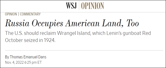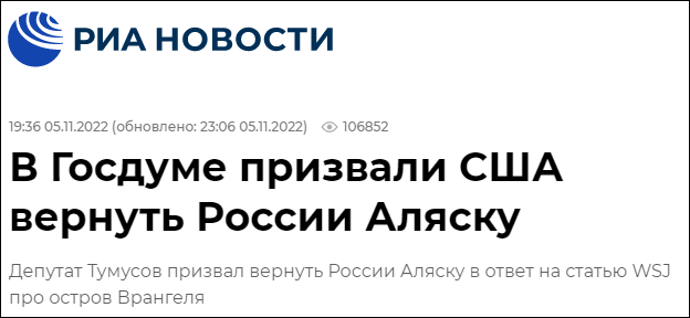 Чжан Чжаодун 2022-11-06 4 ноября американское СМИ "The Wall Street Journal" опубликовало статью, в которой говорится, что остров Врангеля, российский остров в Северном Ледовитом океане, является территорией США и “оккупирован” Россией. Соединенные Штаты должны вернуть его; В связи с этим Тумусов, депутат Государственной Думы России решительно ответил, что Россия не отдаст ни пяди территории, а Соединенные Штаты должны вернуть Аляску России.
