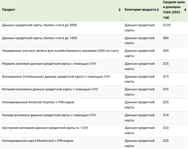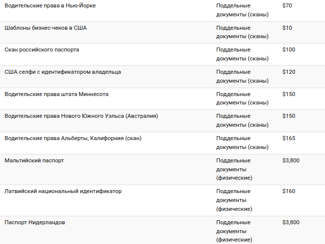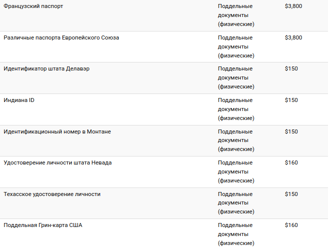 privacyaffairs.com предоставляет информацию о некоторых из самых популярных продуктов, которые продаются в Темной Сети, таких как данные кредитных карт, поддельные документы и взломанная информация, а также перечисляет среднюю цену каждого продукта.