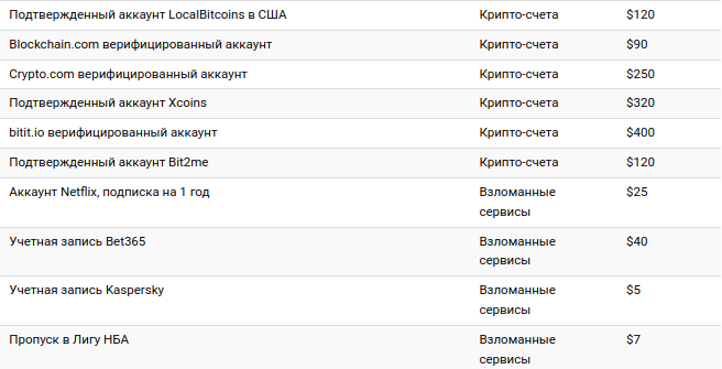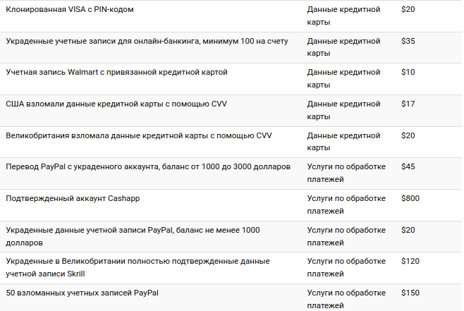 На другом конце спектра находятся данные учетной записи Paypal, логины Netflix или данные украденной кредитной карты (в комплекте с CVV), доступные менее чем за 20 долларов.