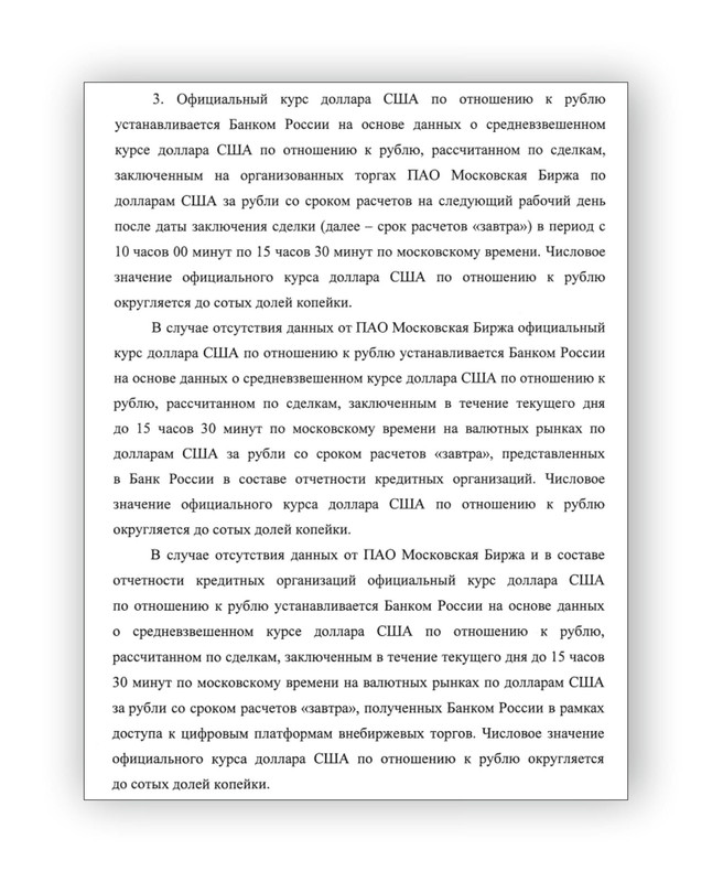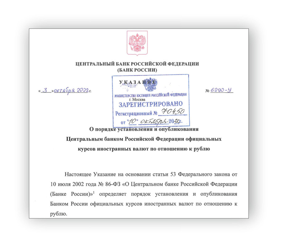 Цитата: LightElf от 04.06.2024 20:30:45У ЦБ имеется масса средств для влияния на курс. Начиная от интервенций и заканчивая полной остановкой торгов. Не говоря про более прицельные методы, вроде ограничения на валютные активы банков, запрета валютных опционов и тыды.Не хочется Вас расстраивать, но эта ЕЖЕДНЕВНАЯ процедура УСТАНОВЛЕНИЯ текущего курса валют выглядит куда прозаичнее. См. Указание Банка России от 3 октября 2022 года № 6290-У «О порядке УСТАНОВЛЕНИЯ И ОПУБЛИКОВАНИЯ Центральным банком Российской Федерации официальных курсов иностранных валют по отношению к рублю». Если Вам в лом зайти на сайт ЦБ, чтобы раз и навсегда прикрыть так возбудившую Вас тему, загляните под два спойлера, расположенных ниже: