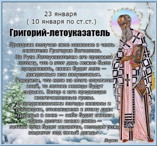 В народном календаре 23 января называют Григорий Летоуказатель. На Руси в этот день устраивали народные гуляния, чтобы скрасить ожидание весны.