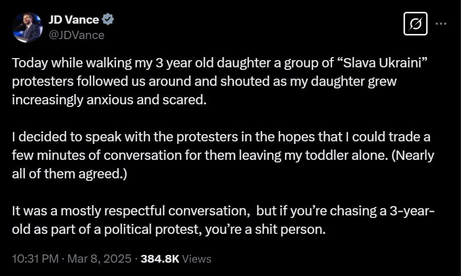 Вице-президент США вчера прогуливался с 3-летней дочуркой, которую напугали дикари из Свынарнии. Всё, что связано со "своими детьми", которым грозит опасность от "чужих злодеев" всегда беспроигрышная тема, которая позволяет максимально быстро демонизировать выбранную социальную группу.
