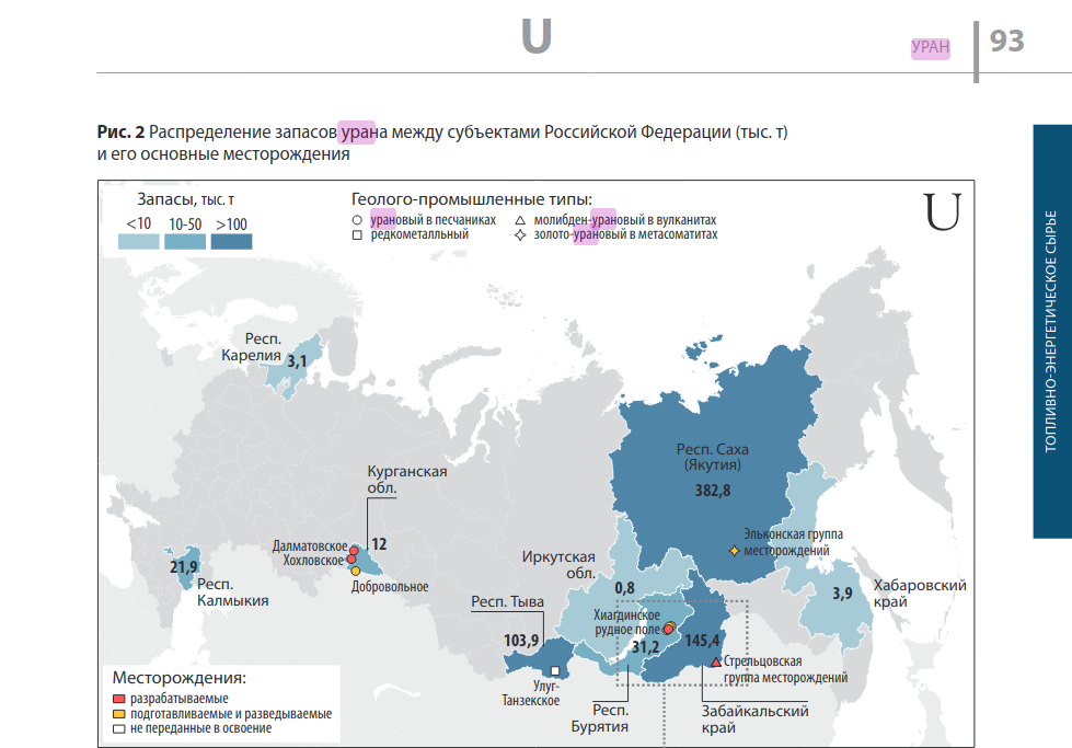 Цитата: ЦитатаРоссия, по данным АЯЭ/МАГАТЭ, занимает 4 место в мире (после Австралии, Казахстана и Канады) по ресурсам урана (Identified resources (recoverable) — IRR) и 6 место — по его производству. При этом Госкорпорация «Росатом» (ГК «Росатом»), в структуру которой входят предприятия АО «Атомредметзолото» (недропользователь отечественных урановорудных объектов) и Uranium One (оператор зарубежныхурановорудных объектов), занимает второе место по добыче природного урана среди урандобывающих компаний мираВажную роль играет Курганская область, в недрах которой заключено 1,7% российских запасов урана; здесь расположены месторождения песчаникового типа Далматовское, Хохловское и Добровольное (Зауральский УРР). Перспективы расширения сырьевой базы урана в регионе не определены