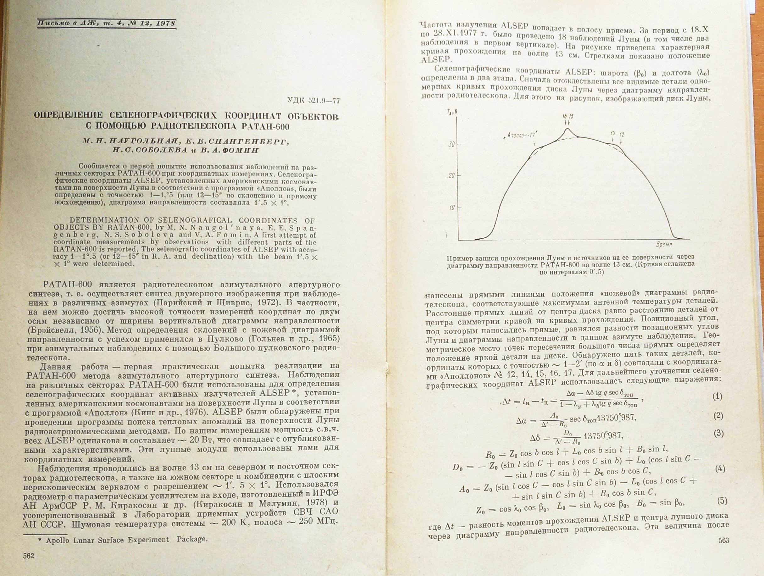 ЦитатаРатан-600 зафиксировал работающие передатчики ALSEP ? Где ответ ?Про РАТАН 600 тебе уже все сказали другие люди, но прежде чем с таким апломбом напрыгивать надо бы представить работу по этой фиксации, а не слухи и перепечатки с различных изданий. Виноградов тоже вроде как имел американский грунт, только вот в его работе стоит сноска, что данные по данному грунту взяты из американских источников.