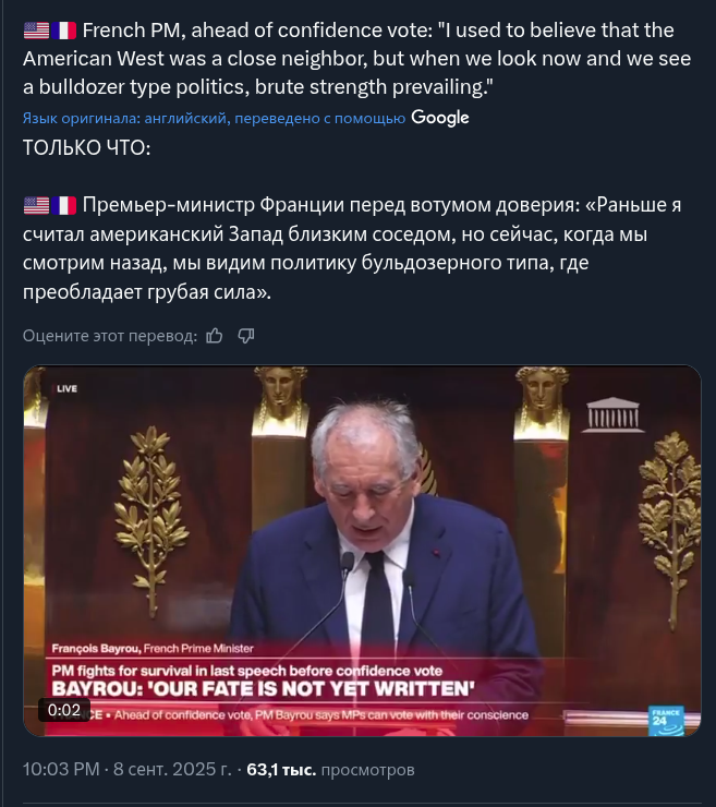 Нацсобрание Франции проголосовало за вотум недоверия кабмину Франсуа Байру. Теперь в республике могут состояться внеочередные выборы, к которым призывает оппозиция