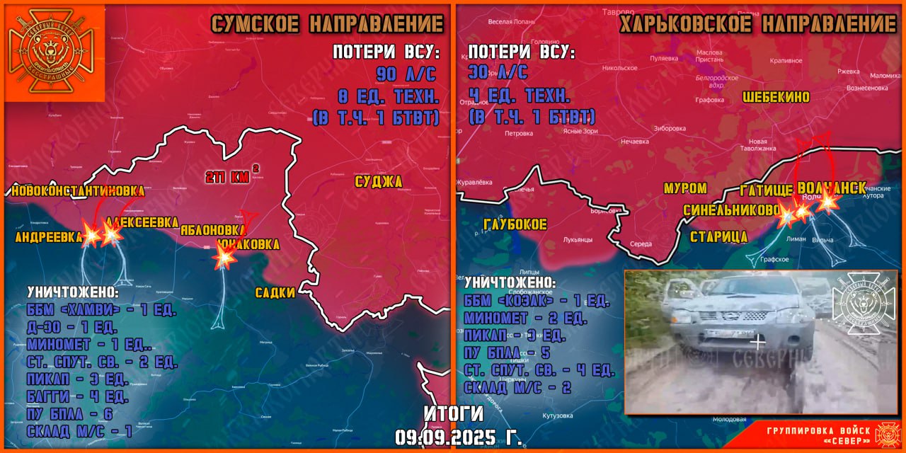 9 сентября группировка войск "Север" продолжила создание полосы безопасности в Харьковской и Сумской областях.На Сумском направлении.По всему участку фронта продолжаются тяжелые бои. Противник не оставляет попыток прорвать правый фланг наступающей группировки Северян. Российская авиация и ракетчики наращивают количество ударов по скоплениям живой силы и техники ВСУ.