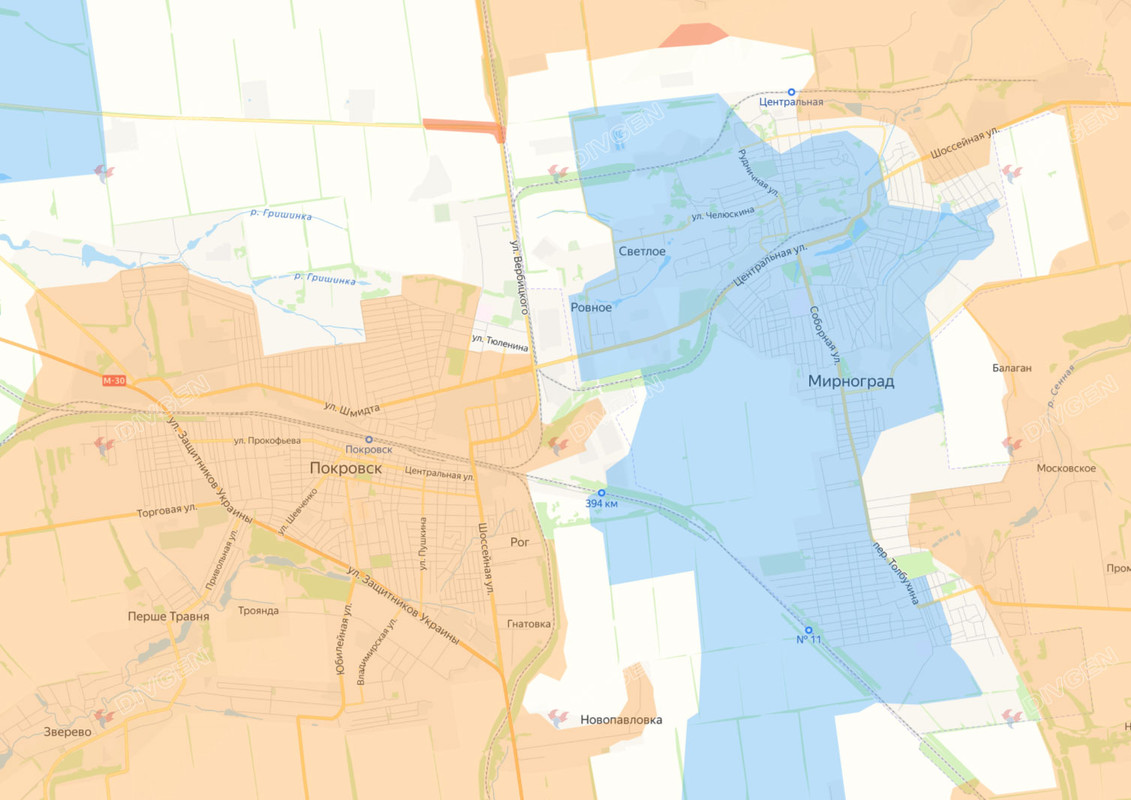 В Покровске хохлы контролируют лишь 2% города (несколько частных домов на северо-востоке по улице Громова), остальное наши уже освободили. По сути этот весьма крупный и важный город (30 км2, 75 тыс. в 1994, 61 тыс. в 2021) практически полностью освобожден, идёт дозачистка последнего кусочка северо-восточной окраины.