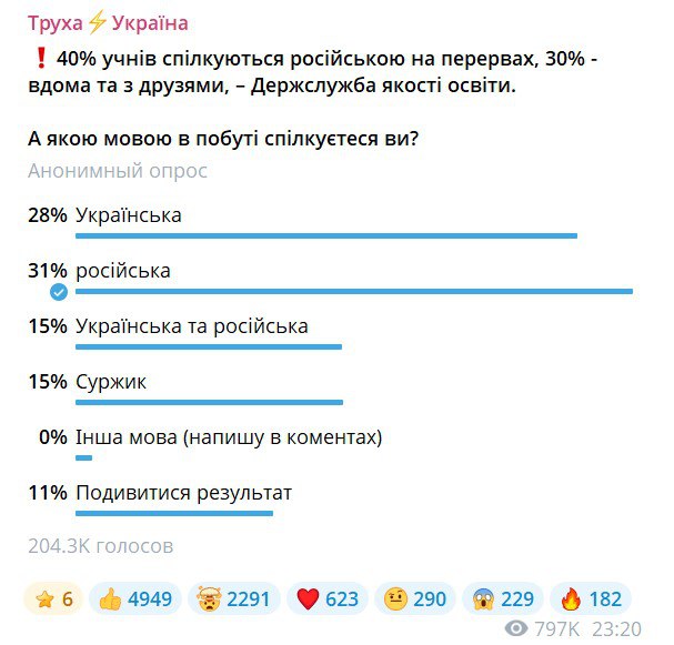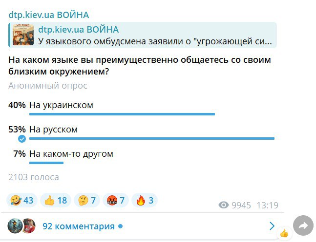 ▪️Кампания против русского языка на Украине дала сбой.По данным опросов популярных украинских пабликов, большинство украинцев по-прежнему общаются между собой на русском языке.