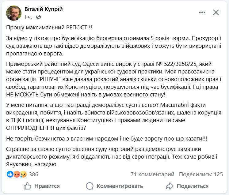 ▪️За видео в тик-ток с "бусификацией" украинская блогерша получила пять лет тюрьмы.Прокурор и суд посчитали, что такие видео деморализуют военных и могут быть использованы российской пропагандой.