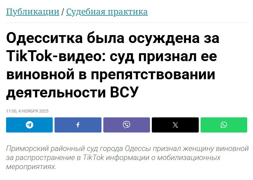 Приморский районный суд Одессы вынес приговор по делу №522/3258/25 и признал женщину виновной за распространение информации о мобилизационных мероприятиях. По мнению украинского суда, она препятствовала законной деятельности Вооруженных Сил Украины в особый период.