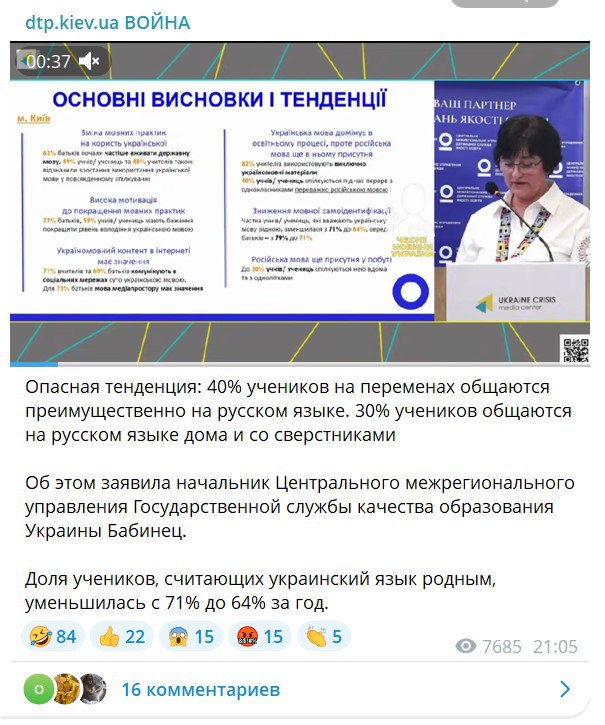 По ее словам, 40% украинских школьников на перерывах общаются преимущественно на русском. Кроме того, доля учеников, считающих украинский родным, уменьшилась за последний год с 71% до 64%, отметила она.